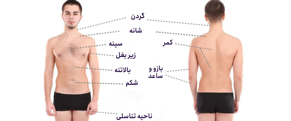 پشت: برخی مردان موهای پشت خود را به دلایل زیبایی یا احساس راحتی بیشتر اصلاح میکنند.